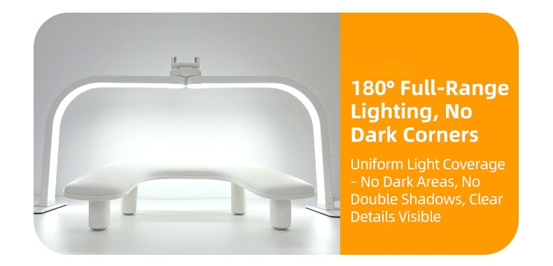 The half-moon light design provides balanced, shadow-reduced illumination across the nail desk.